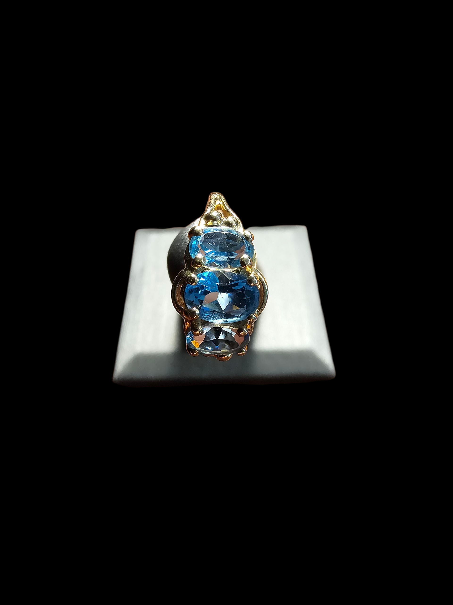 This elegant 10k gold ring features three stunning blue topaz stones, expertly set to showcase their vibrant color and clarity. Designed for size 5, it offers a refined balance of sophistication and durability, making it an ideal choice for those seeking timeless beauty with expert craftsmanship. Perfect for both everyday wear and special occasions.