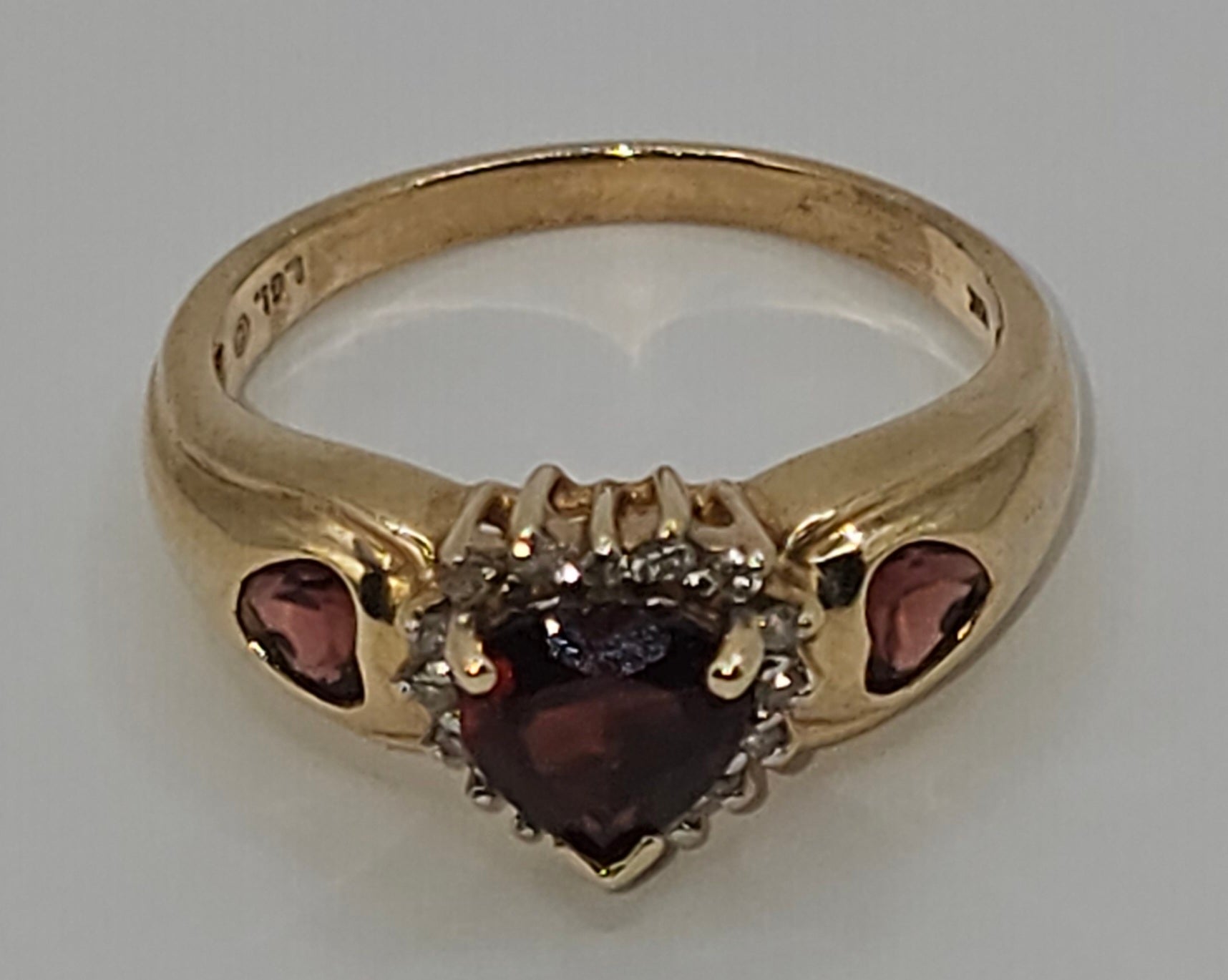 This exquisite 10k gold ring features a heart-shaped garnet centerpiece flanked by two sparkling stones, enhanced with delicate diamond accents. Expertly crafted, it combines timeless elegance with a touch of romance, making it a perfect statement piece for any occasion. The fine diamond details add brilliance, highlighting the rich red hues of the garnet for a sophisticated and refined look.