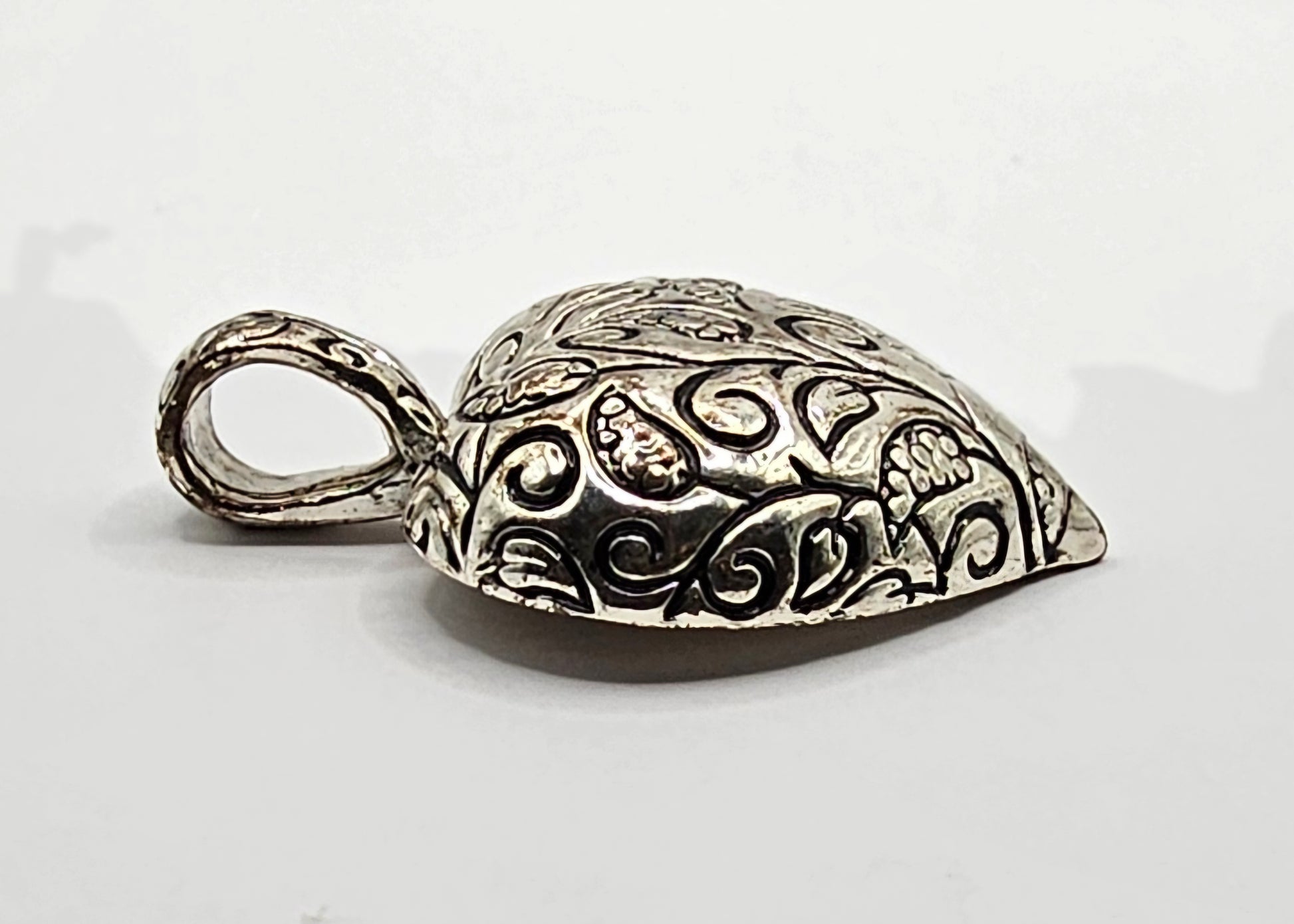 Retro Domed Silver Heart Pendant with leaf design 1.5" x 1.25"